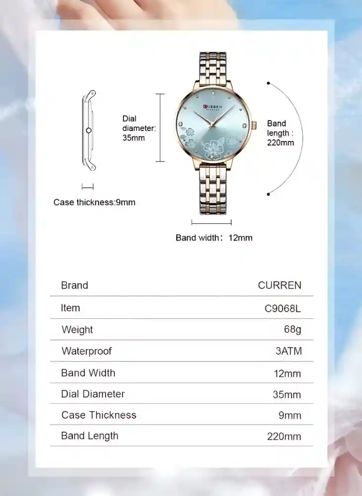 This watch is designed for women who value style and practicality. The lightweight build ensures comfort, while the durable stainless steel strap guarantees longevity. Its water resistance makes it reliable for everyday use, and the floral dial design adds a unique charm. Whether you’re attending a meeting, a party, or a casual outing, the Curren 9068 Women Watch enhances your personality with grace and confidence.